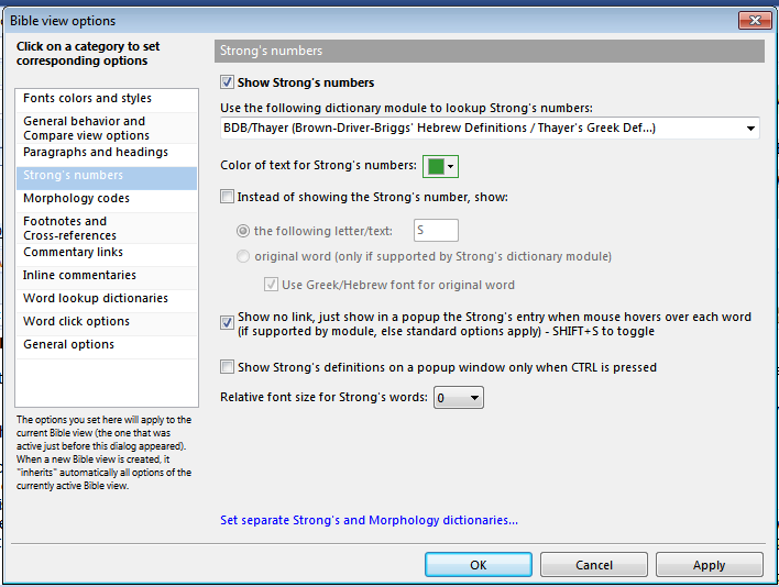 TheWord Tutorial » 02 Basic, Bible Window » BibleView Options: Strong’s Settings